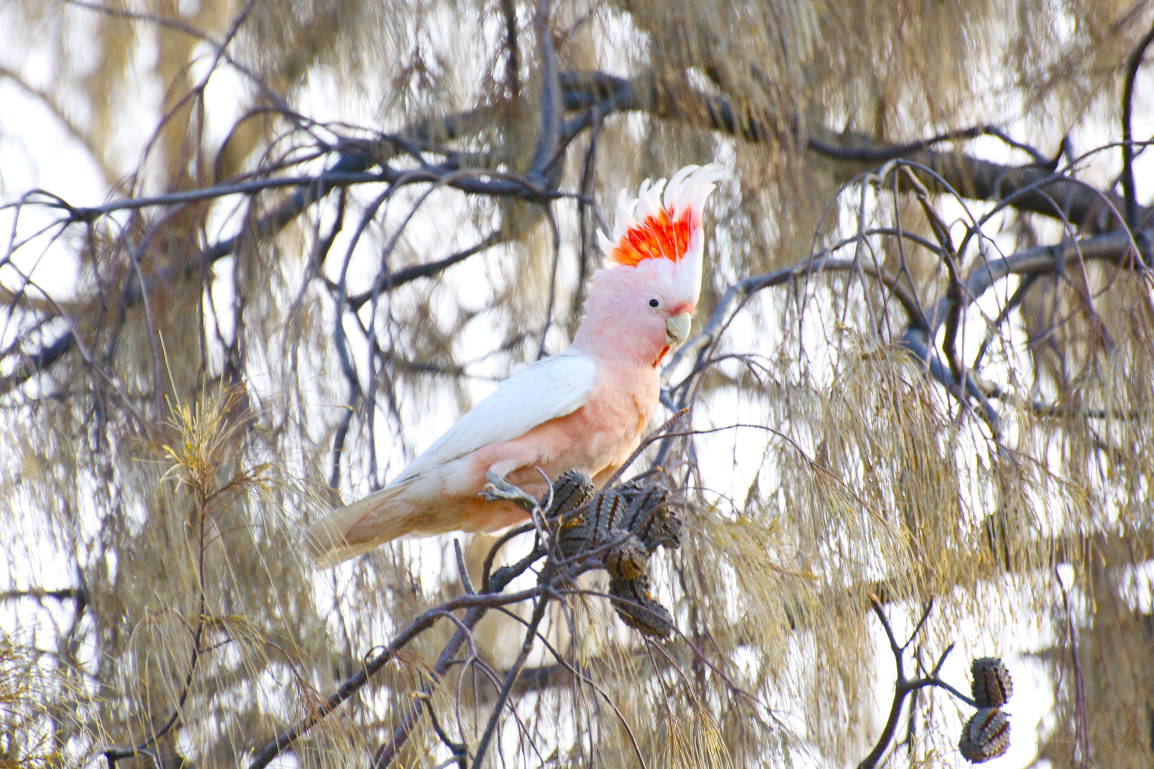 We decided to take an afternoon drive from Uluru to Kata Tjuta, to catch the sunset. It was not the original plan as we had intended to make the trip the next morning, for a hike. The roads are long and straight, cutting through red earth, patched with sparse scrub and coarse grasses. We took a right turn on to the road to Kata Tjuta, when I saw a flock of pale marshmallow pink and red birds dropping in a tumbling loop from high up, across the road in front and up in to a patch of Desert Oak trees. It was obvious that these were cockatoos but were they the ones that I had been searching for or was it yet another flock of Galah? I swerved to a halt on the side of the road, fumbled for my camera and binoculars and jumped out, looking up in to the tree tops. There sat the most beautiful of all the cockatoos, Major Mitchell’s! Named in honour of the Scottish explorer and surveyor, Major Sir Thomas Mitchell who wrote, “Few birds more enliven the monotonous hues of the Australian forest than this beautiful species whose pink-coloured wings and flowing crest might have embellished the air of a more voluptuous region.”