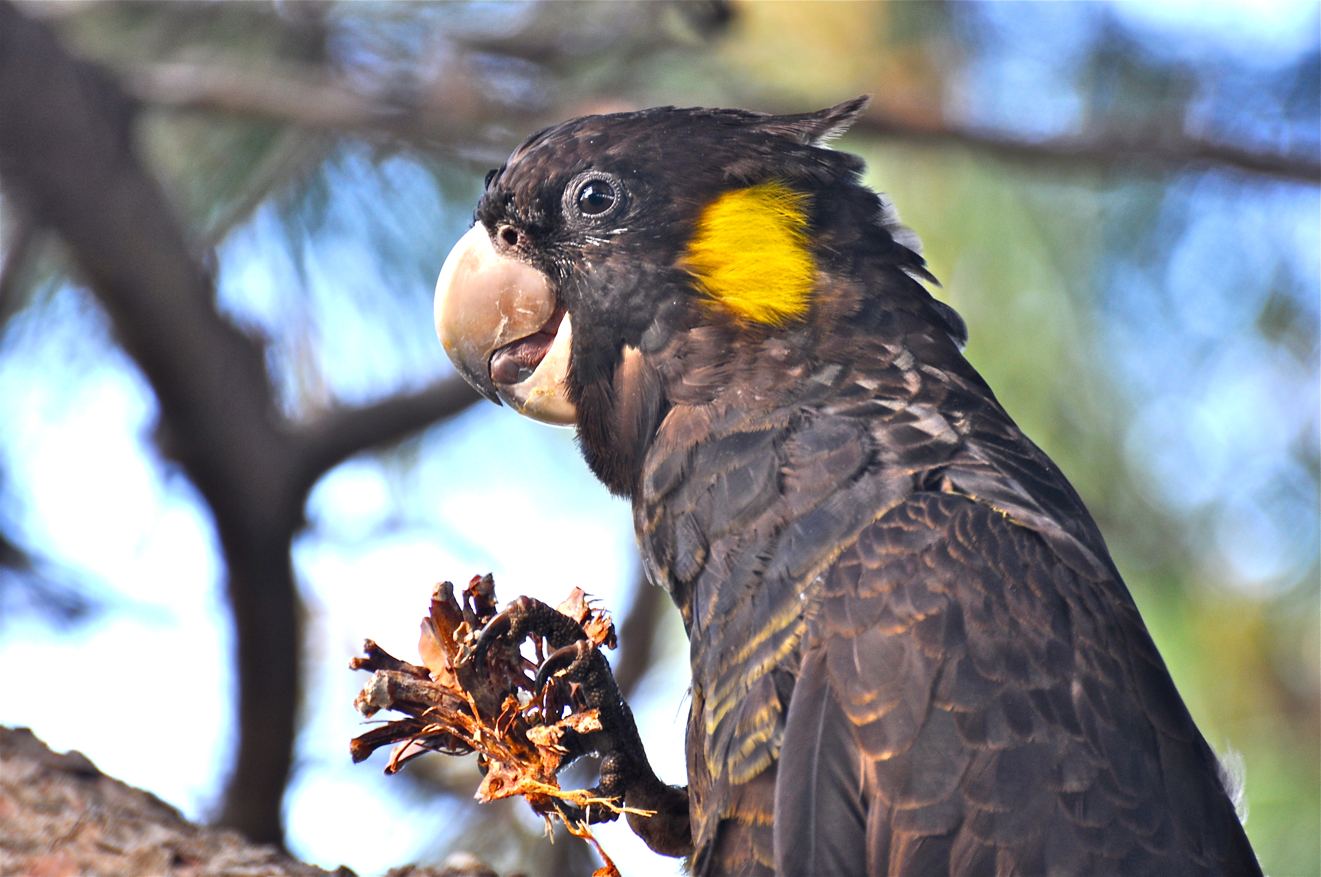 Before my arrival in Australia I was painfully ignorant of the existence of the black cockatoo species. A little research revealed that not only do black cockatoos exist but a small colony of them live in Sydney, in Centennial Park and small groups of them can be seen in the autumn flying over parks in and around the city. Digging in to some local bird books and a hunt through Google revealed the food source of the black cockatoos, and where I might find them in Centennial Park.