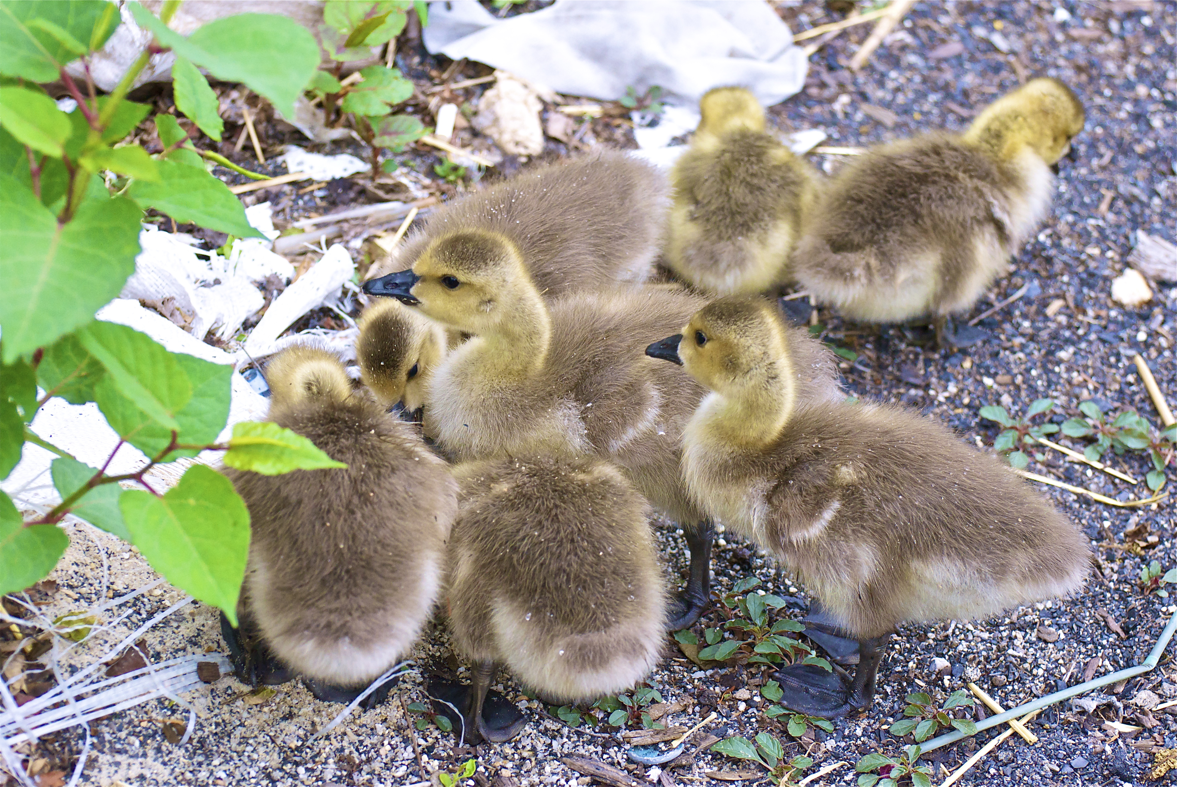 In their second year, male and female Canada geese form bonds for life and are both active parents. My local geese selected nest sites on the ground, on or around the dilapidated piers of Hoboken, New Jersey, where they hatched their young surrounded by people, litter, ferries and feral cats.