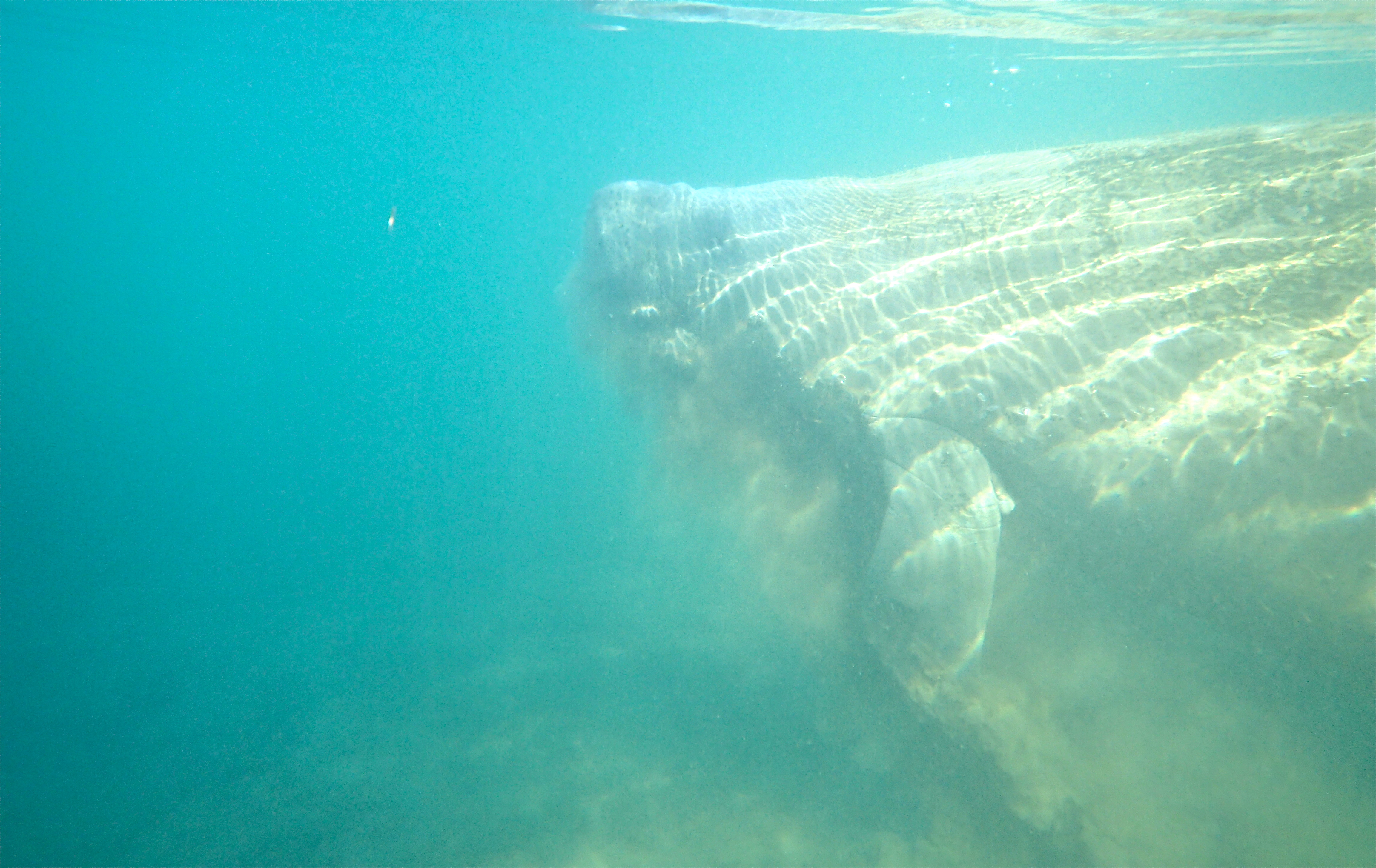Without needing a second invitation I put on my mask and snorkel and slid into the water. I looked down and saw a stingray glide by. Then I was alongside the manatee. It ambled along the river bed, munching pond weed, oblivious to my presence. It was huge! I knew they were big but when you find yourself alongside a creature as big as a couch in an environment alien to you, one cannot help feel a little intimidated. This intimidation very quickly gives way to fascination which collapses into wonder and pure joy.