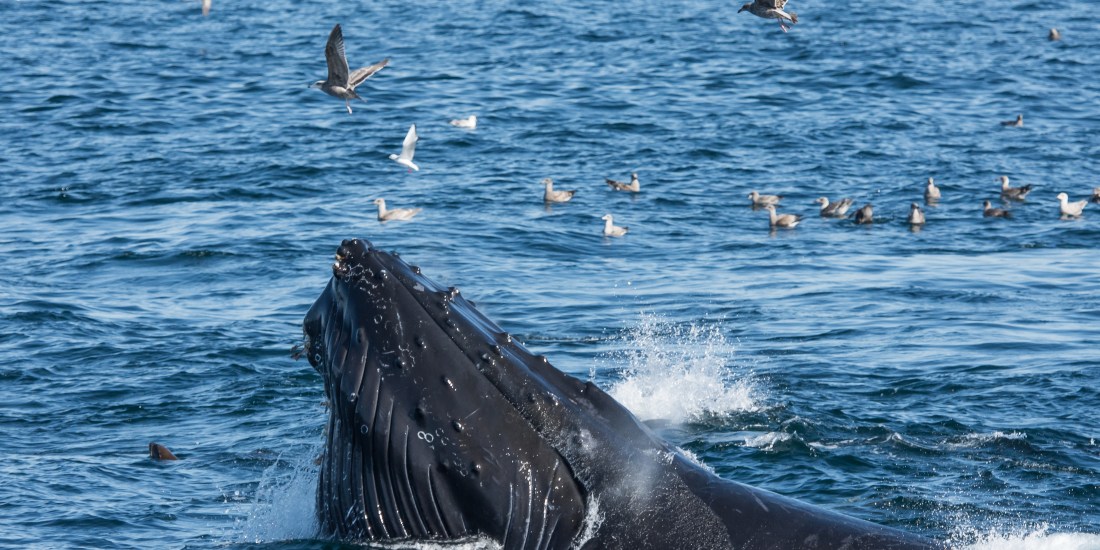 Silence fell over us as the whales slid back into the deep. Some moments passed and with so much activity around us, I didn’t know where to look. Waiting, waiting, waiting. Suddenly the Pacific was torn asunder, as two enormous mouths burst from below, sending a scatter of bait fish, gulls and sea lions. I machine gunned my shutter release as the whales sank beneath the waves.