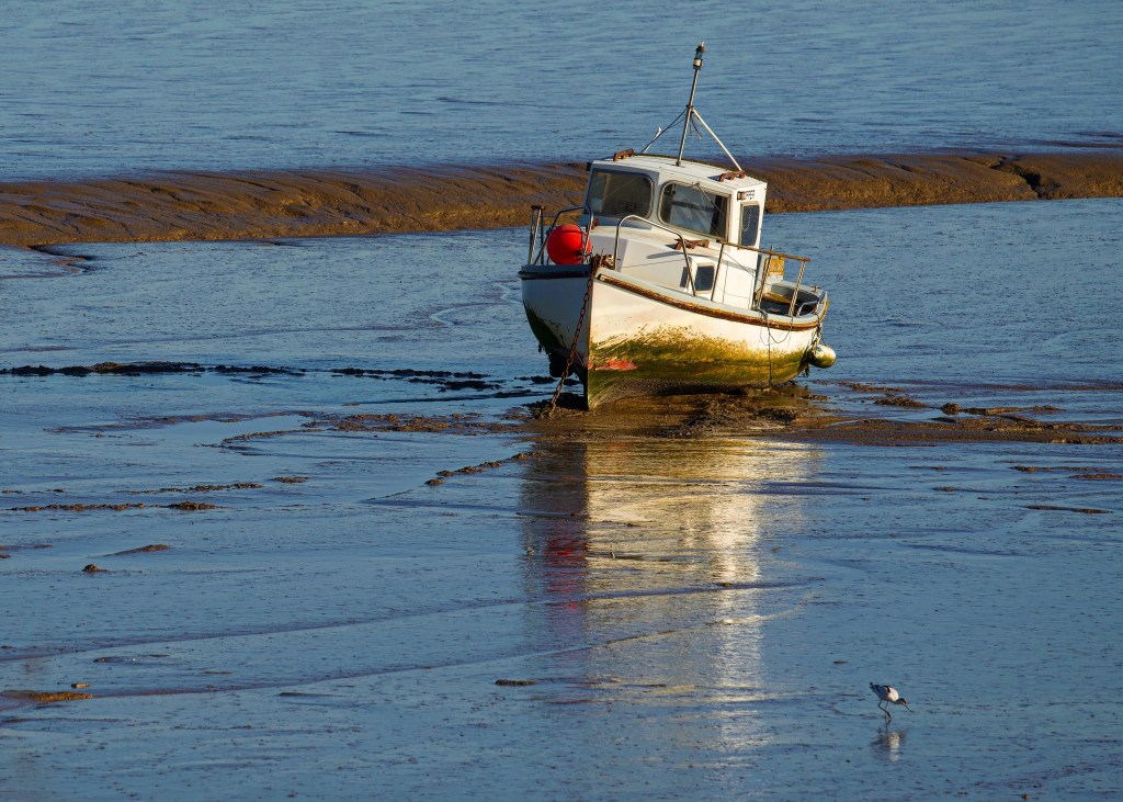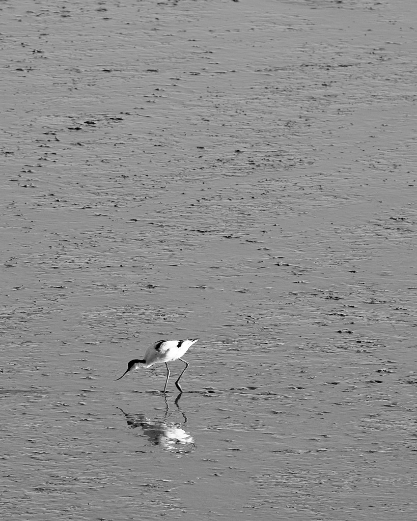 A lone distant Avocet followed a narrow channel carved into the mud, as the tide snapped at its ankles. Freshly exposed mud is where the richest pickings can be found. A bounty of aquatic worms and small crustaceans were exposed and the small bird on a vast mudflat was taking advantage of the opportunity.