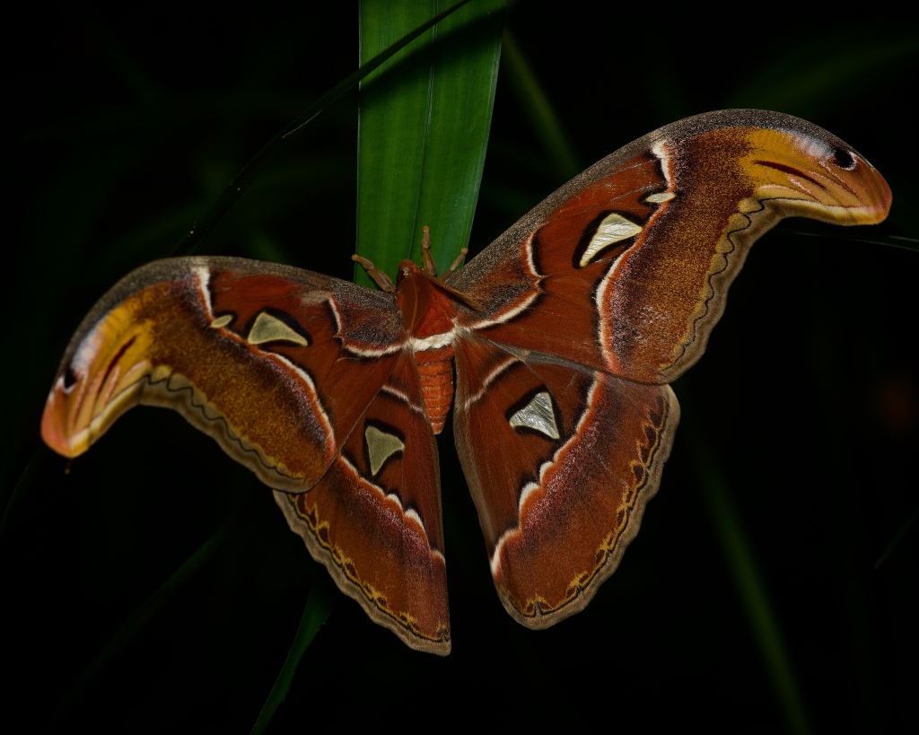 What sets this moth apart from others, is that the Atlas makes a good claim to be planet Earth’s largest moth. It’s wingspan is a whopping 24 cm (9.4 in), which falls a little short to the White Witch moth, but for wing surface area, the Atlas is a winner, with females boasting an impressive 160 cm2 (25 in2) of Burnt Sienna, decorated with golds, silvers, pinks and blacks with a precision that can only found in nature.