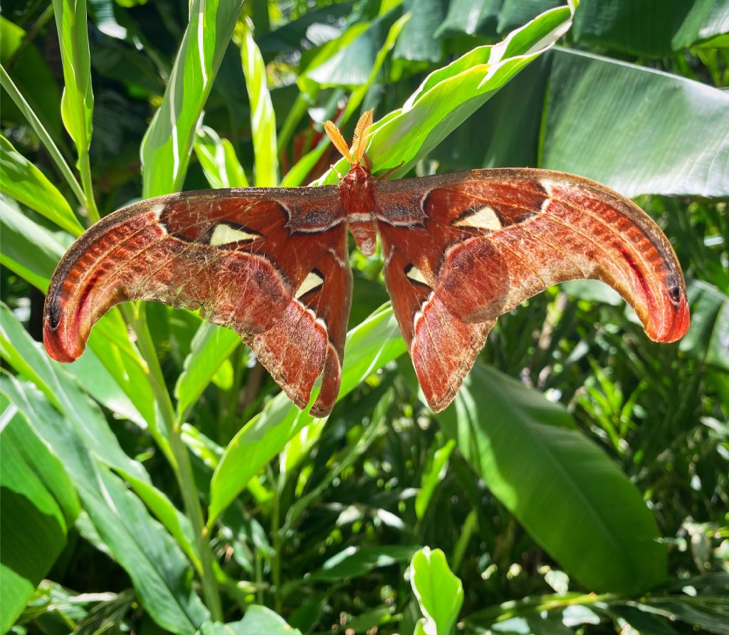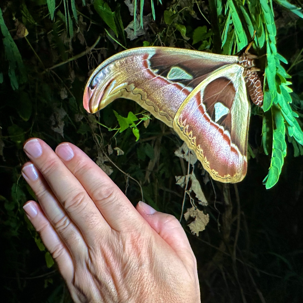 This unexpected urban encounter didn’t detracted from my wide-eyed wonder as I fumbled for my phone camera. This was a real life-list experience for me and I wanted to capture it in pictures before it fluttered away. I crouched beside the moth and drooled over its chestnut powdered wings with dustings of pink and gold. The extraordinary design included a glassy panel on each wing segment. Perhaps I marveled most at the feathery antennae so familiar to me from the moth in my book. It was heart wrenching to walk away from the resting moth, but this would not be my last Atlas encounter.