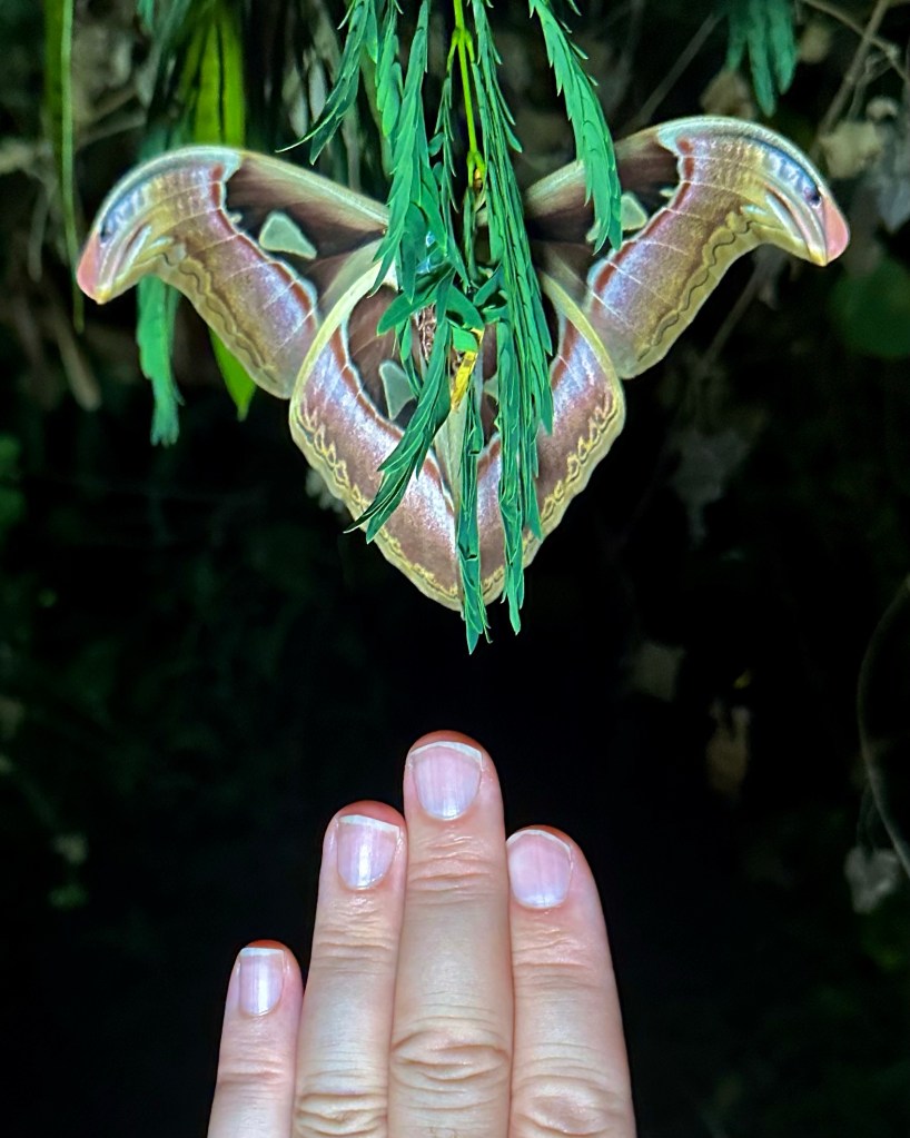 Some time later, I returned to the place where I’d danced with a moth by moonlight. I walked to the tree where I had first found my fat little caterpillar and the cocoon that she had woven. I lifted my light to where the cocoon hung. Wide eyed, I gasped with awe. There, on the silken case hung an immaculate female Atlas moth, patiently waiting for her wings to find the strength to lift her high into the Singapore night.