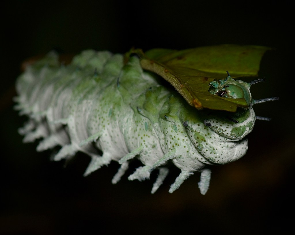 It was a hot and humid Singapore night. I walked along the track with my torch swishing from side to side, hoping to catch the glow of iridescent snake scales. The beam of light traveled up a narrow tree trunk and along the branches. I stopped. Something flared white in the light at the end of a thin branch. Was it a little bronzeback snake? I stepped closer and realised that I had found something that I hadn’t imagined ever finding – an Atlas moth caterpillar.